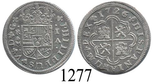 Madrid, Spain, milled 1 real "pistareen," Philip V, 1726/1A, unique overdate. 2.8 grams. Very bold overdate (unlisted), nice XF with partially crude rim on off-center reverse.