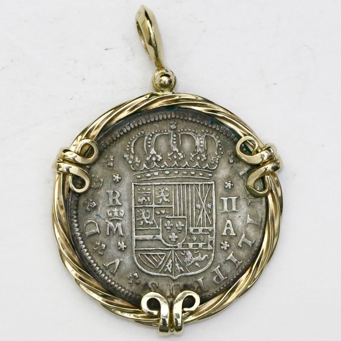 Madrid, Spain, milled 2 reales "pistareen," Philip V, 1723A, (roller dies- a rodillo) mounted cross-side out in rope-style 14K gold bezel. 11.24 grams total. VF+ coin, light cleaning on surface now starting to tone over with a golden orange hue. With photo-certificate.