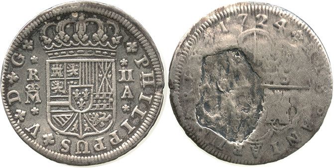 Madrid, Spain, milled 2 reales "pistareen," Philip V, 1724A. KM-296. 4.1 grams. Choice XF obverse, nicely toned, but cross side weak and corroded, with large pit. Recovered from: Unidentified 1700s wreck in the English Channel
