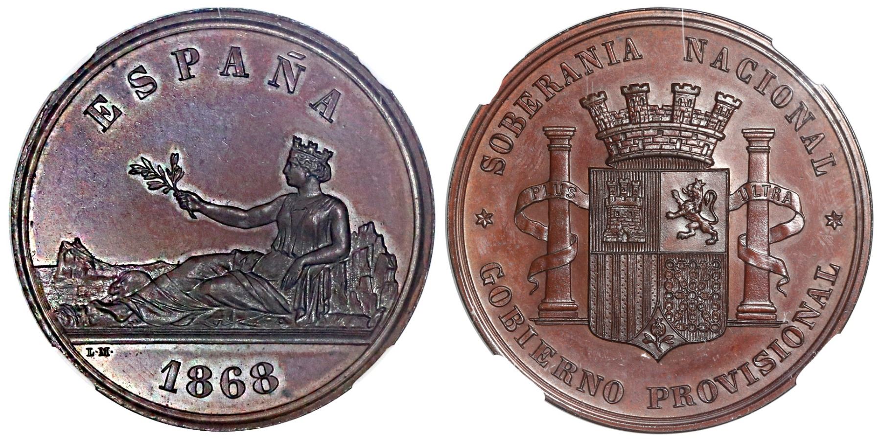 Madrid, Spain (provisional government), bronze pattern 5 pesetas, 1868, rare, NGC MS 64 BN. CT-p. 806. Cherry-red surfaces with underlying luster, no marks, sharper details and taller rims than normal so more like a specimen strike (at the very least, specially handled), tied with one other for finest known in NGC census. NGC #4659068-005.