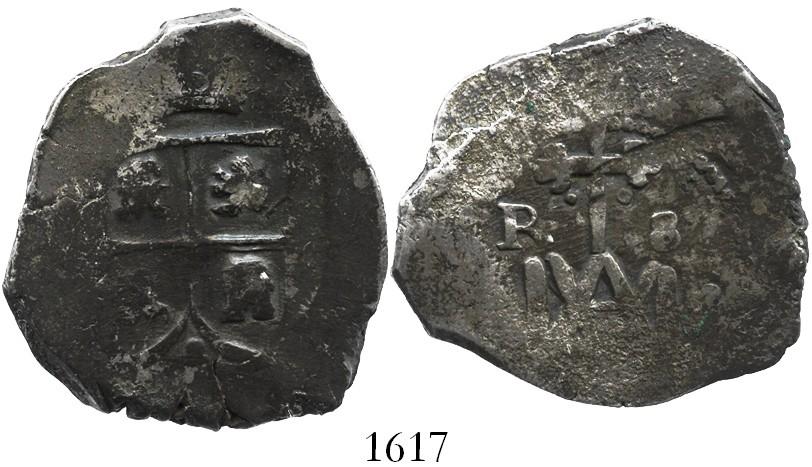 Madrid or Seville, Spain, cob 8 reales, Charles II, assayer not visible, "Maria" type (1686-99), assayer not visible. KM-206. 21.5 grams. Decent centers but otherwise typically crude and flat, deeply toned Fine. This brief issue resulted from a monetary reform in 1686 in which a new mainland Spanish standard of 21.9 grams per 8R was introduced at the Seville mint. The "Maria" moniker clearly refers to the central design of a cross-topped MA monogram, which probably stands for the Queen Mother, Maria Anna of Austria, who acted as regent for most of Charles' reign.