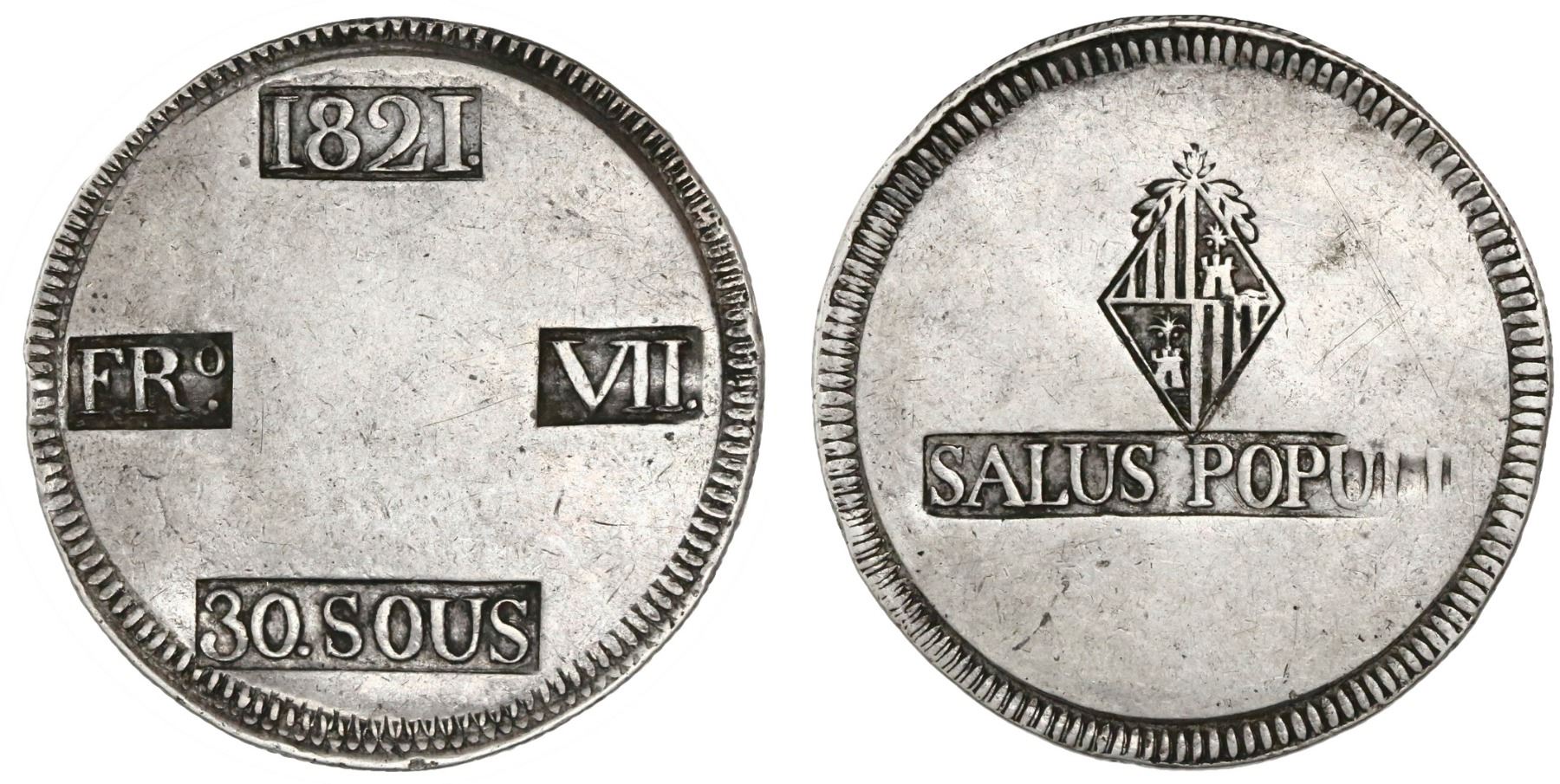 Mallorca, Spain (Balearic Islands), 30 sueldos (30 sous), Ferdinand VII, 1821.
