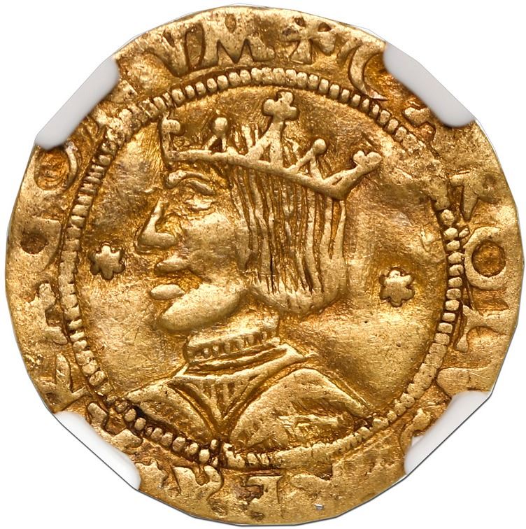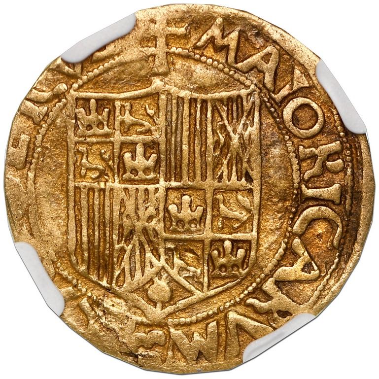 Mallorca, Spain, gold 1 ducat, Charles I (1516-56), stars flanking bust, assayer not visible, NGC XF 45, finest and only example in NGC census. Cal-108; Fr-54. 3.36 grams. Bold portrait of king, full but off-center shield enabling a full MAIORICARVM in legend before an unclear assayer-mark (supposedly a small shield with crescents), nicely toned around the details, overall a rather decent example of this rarely seen type from the island of Mallorca.
