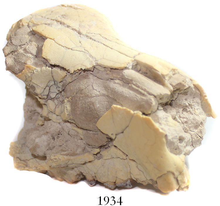 Mammal skull, Oreodont, approx. 30 to 35 million years old (Tertiary period, Oligocene epoch), probably from South Dakota. 690 grams; roughly 4-1/2" x 3" x 4". Just the upper jaw up to the crown, with most of the teeth in evidence, the bone itself fractured but stable, one part of the jaw glued back on with (obvious) dark-brown epoxy.