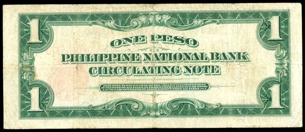 Manila, Philippines, Philippine National Bank, 1 peso, series of 1924, serial D4015577D. Pick-17. About VF with bold red serial numbers and seal.