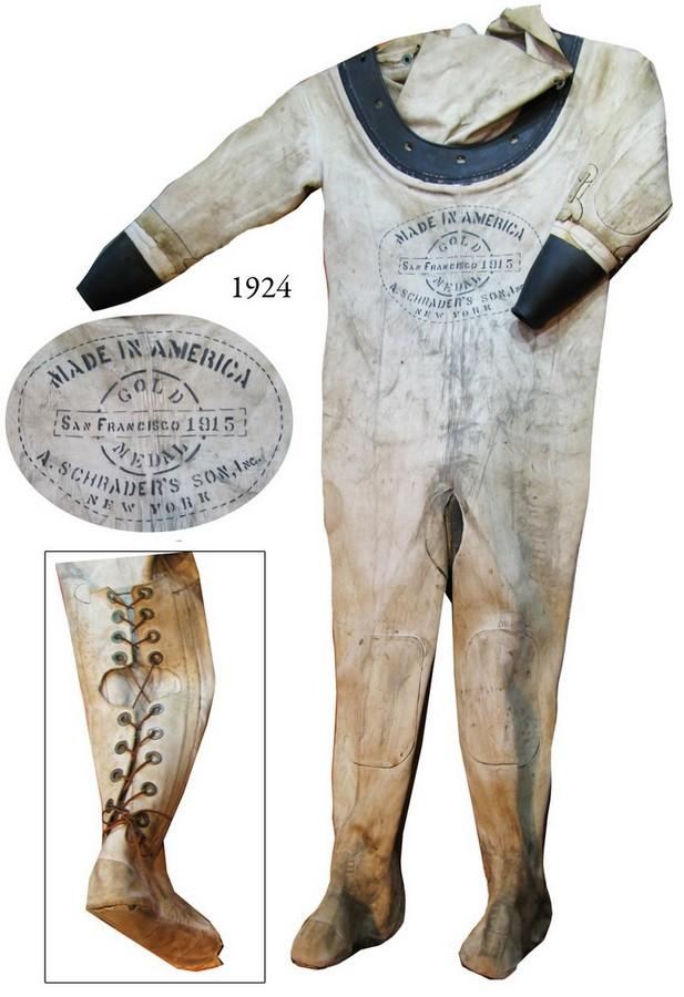Mark V diving dress (canvas suit) with 1915 Schrader stencil. About 15 lb and 74" tall. Designed to be used with the famous U.S. Navy Mark V dive helmet, this full, rubber-lined canvas suit is in excellent condition, with just a couple old repairs and some fraying at the toes, obviously well used in its time but still with clear stenciling on breast, great for display!