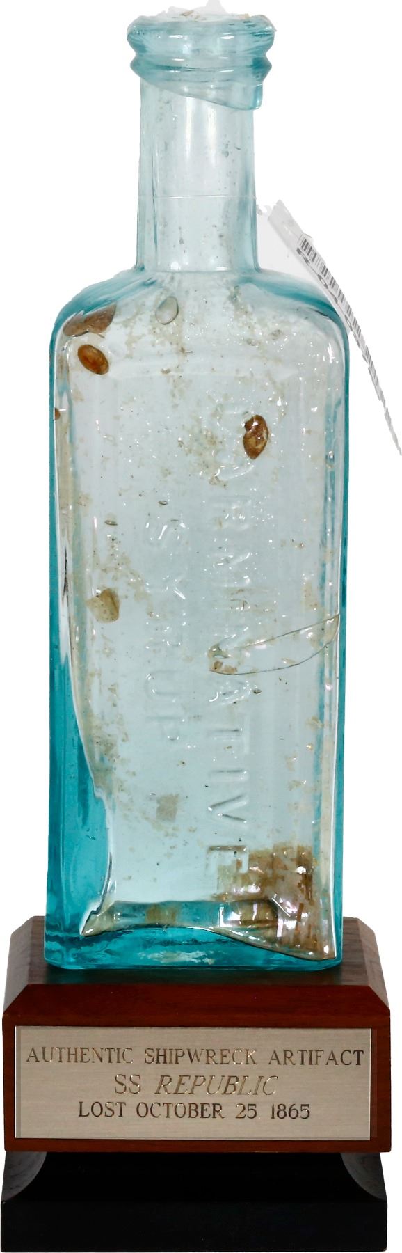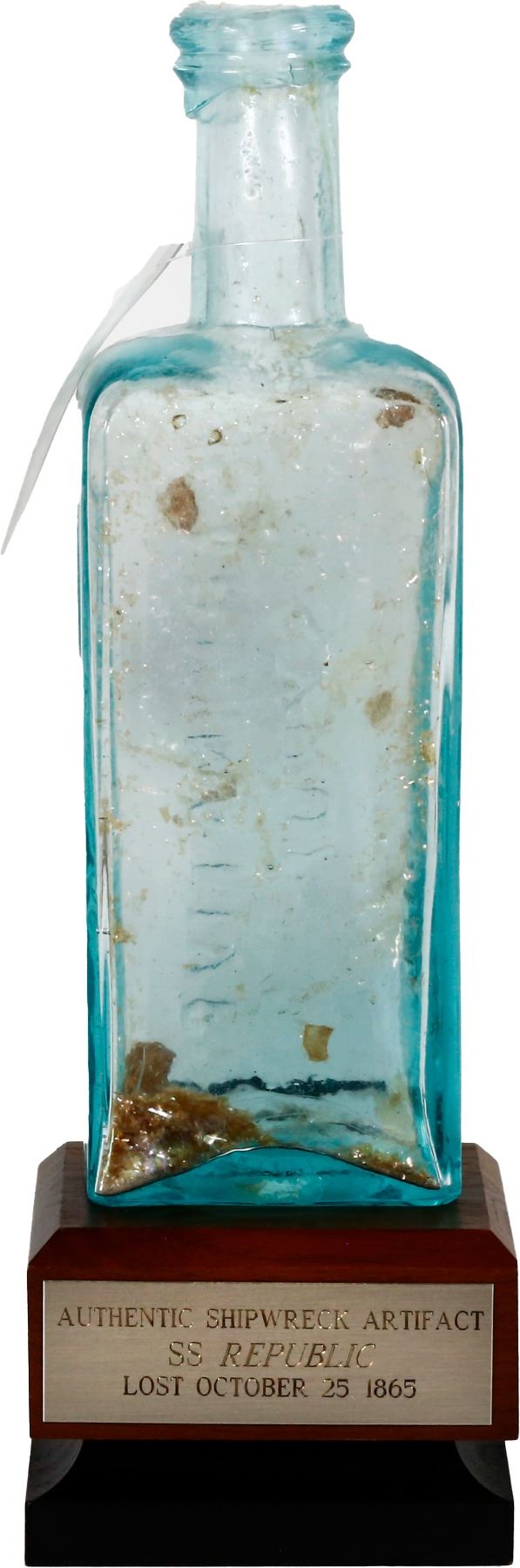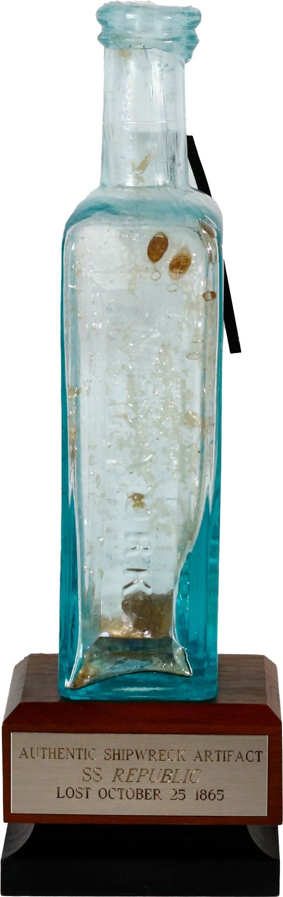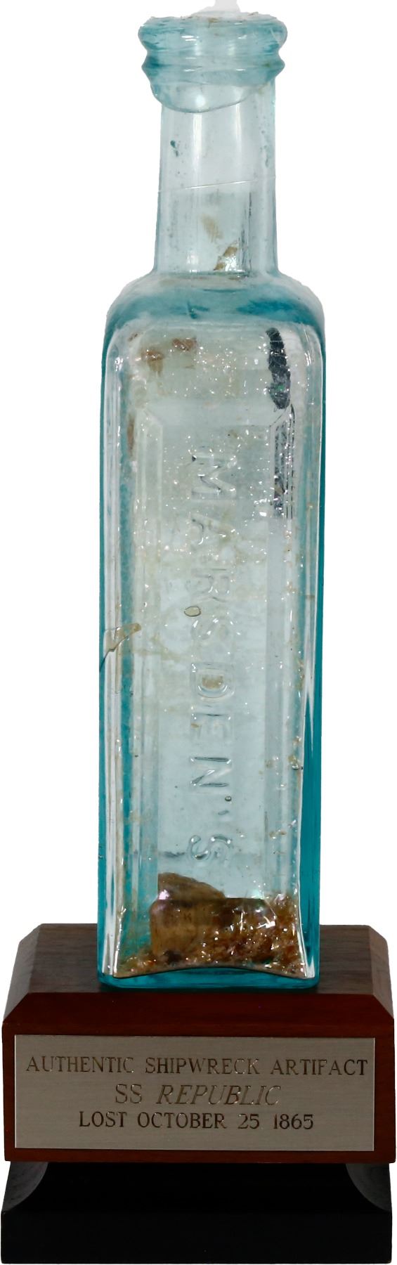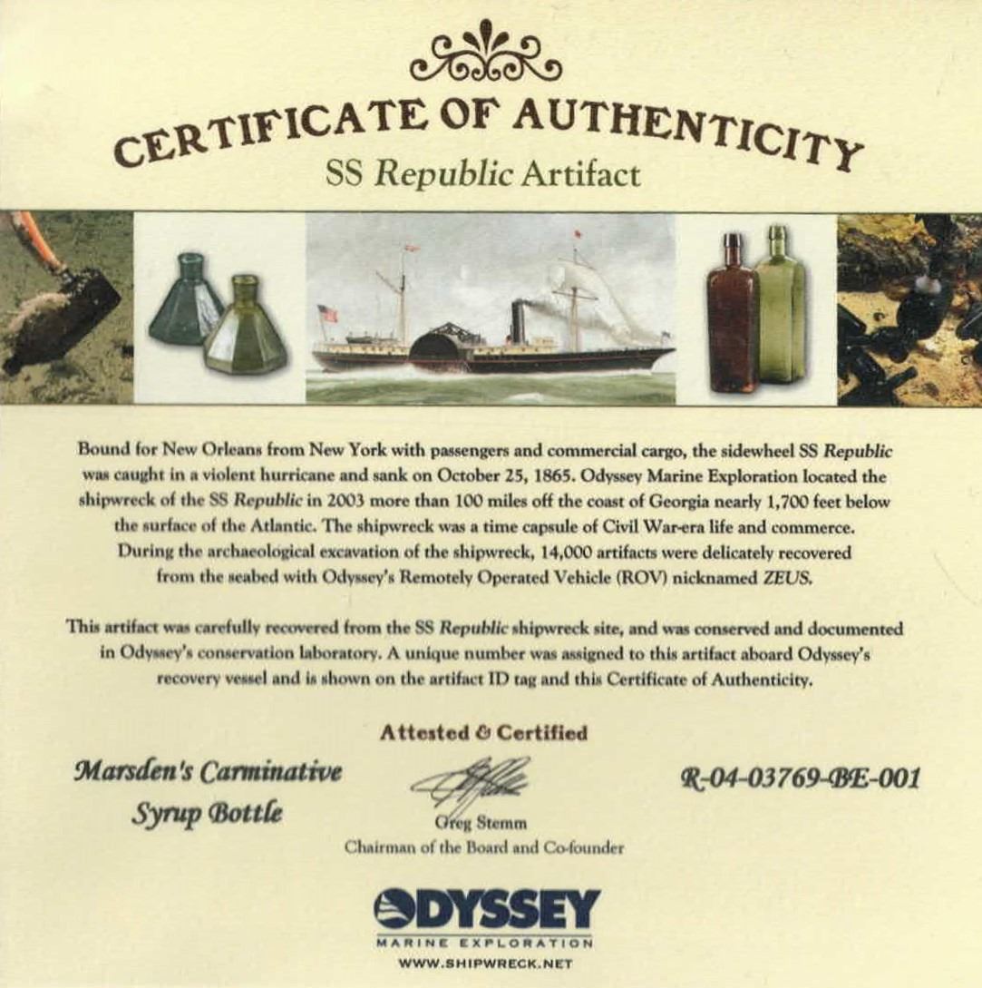 Marsden's Carminative Syrup (New York) glass bottle, ex-S.S. Republic (1865). 310 grams. 7¼" x 2¼" x 1¾". Light green glass bottle with "Marsden's," "Carminative Syrup," and "New York" embossed vertically on three sides, original cork punched into the bottle, displayed on an attractive wooden stand with plaque. The former contents were touted as an herbal remedy for intestinal gas and flatulence. From the S.S. Republic (1865), with original certificate from the salvors and small wooden stand with plaque. SOLD FOR THE BENEFIT OF THE 1715 FLEET SOCIETY.