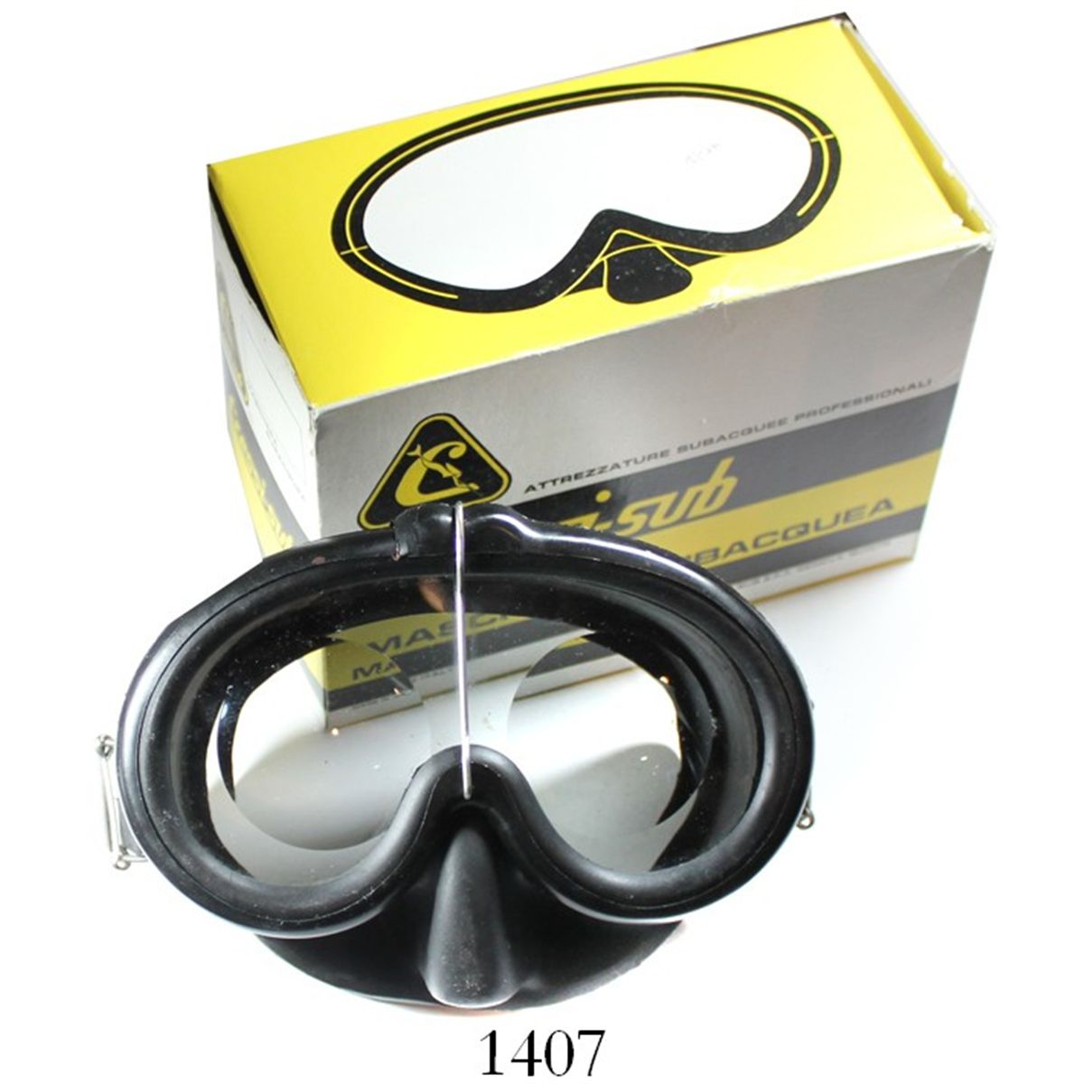 Marty Meylach's personal dive mask, in original box, with prescription lenses, pictured in Flash of Gold. 261 grams (in box), roughly 7" x 5" x 3". Vintage Italian rubber-and-glass mask made by Cressi-sub (the world's oldest underwater diving supply company), model Pinocchio, its glass custom-made to Marty's eyesight-correcting prescription, lacking the strap but not for wearing so much as having a unique connection to the famous diver and author. Pedigreed to the Marty Meylach collection, and pictured in several places in his book.