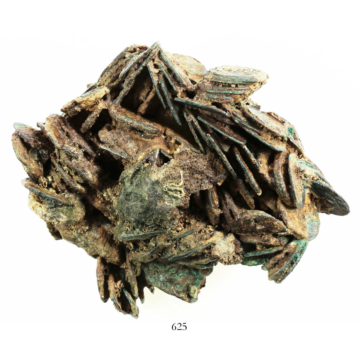 Massive clump of approx. 150+ Dutch East India Co. copper duits dated 1752. 1034 grams total, approx. 5" in diameter. An impressively large and attractive display of coins, many with details visible but also with lots of green and brown encrustation around and between the coins, mostly a jumble of small stacks, truly one of the neatest clumps we have seen in a long time. With original (generic) certificate from the salvagers. Recovered from: Bredenhof, sunk in 1753 off Mozambique, east of Africa