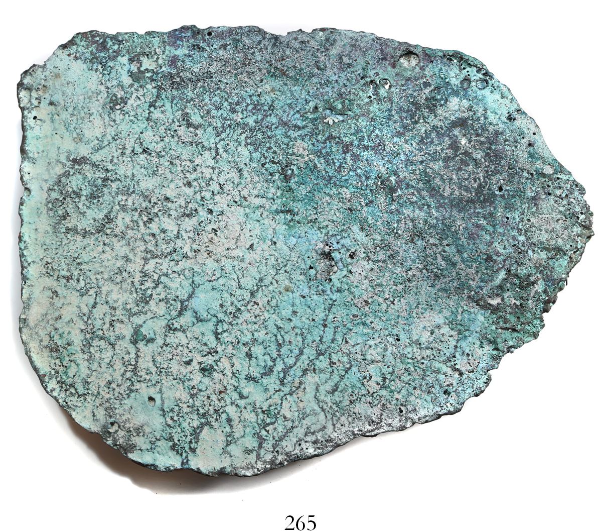 Massive copper ingot (88 lb) from the Atocha (1622). Roughly 15-1/2" x 12" x 3-1/2". Massive chunk of pure copper from Cuban mines, unmarked but with lovely green-and-white patina on flat top, the roundish bottom with purplish toning all over. From the Atocha (1622), with Fisher photo-certificate #86A-226.