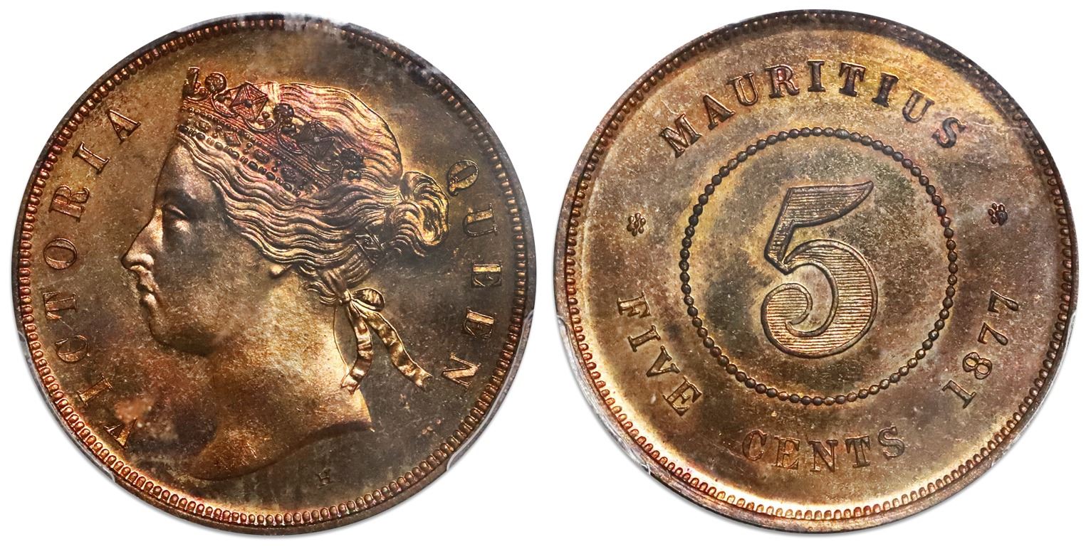 Mauritius (struck at the Heaton Mint, Birmingham, England), bronze 5 cents specimen, Victoria, 1877-H, medal axis, PCGS SP66 RB, finest known in both NGC and PCGS censuses, ex-Heaton Mint Archives. KM-9. Bright and glossy in golden-red color with slight incipient darkening on reverse, minimal marks, the finest of just three at PCGS, the only other one certified being a single SP 58 BN at NGC. PCGS #80048476. Pedigreed to the Heaton Mint Archives.