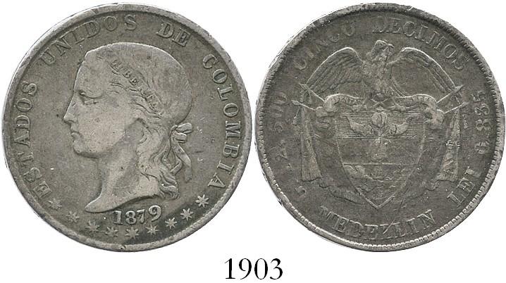 Medellín, Colombia, 5 décimos, 1879/4, pointed-tail 9.