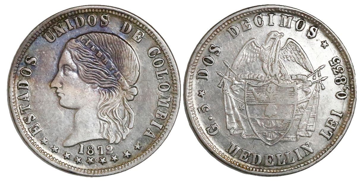Medellin, Colombia, 2 decimos, 1872, ex-Lozano. Restrepo-282.3; KM-155.2. 4.97 grams. Lustrous AU- with splash of purple toning at top of obverse, slightly weak center of shield. Pedigreed to the Alberto Lozano Villegas collection (Numismaticos Colombianos auction of July, 2004, lot #85)