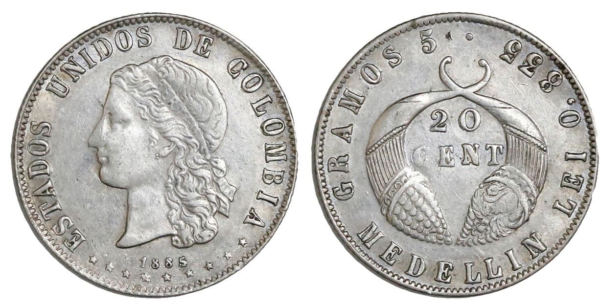 Medellin, Colombia, 20 centavos, 1885, fineness 0.835/0.500, ex-Lozano.