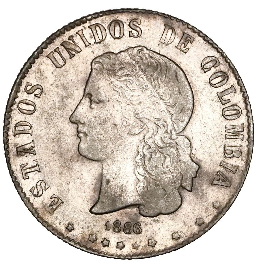 Medellin, Colombia, 20 centavos, 1886, very rare, NGC VF details / cleaned, Restrepo Plate. Restrepo-291.1; KM-178.3a. Very rare one-year type struck in 0.500 fineness (the only such coin of this denomination), the debased silver manifest in a light rosy hue, with muted luster and rather nice strike with full details, light porosity on part of reverse, overall more like AU in our estimation, arguably comparable to the Eldorado specimen that hammered for $2400 in 2018 (Restrepo estimates $5000 for XF). NGC #5938641-014. Pedigreed to the Nueva Granada collection (stated on label).