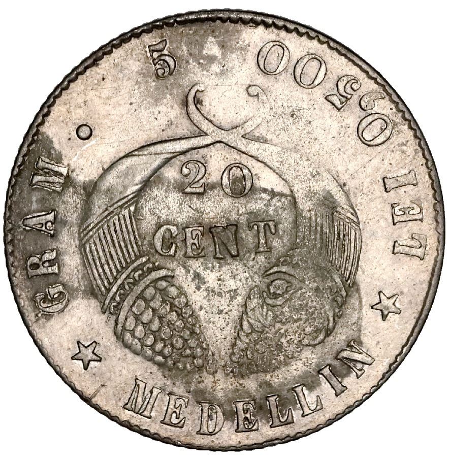 Medellin, Colombia, 20 centavos, 1886, very rare, NGC VF details / cleaned, Restrepo Plate.