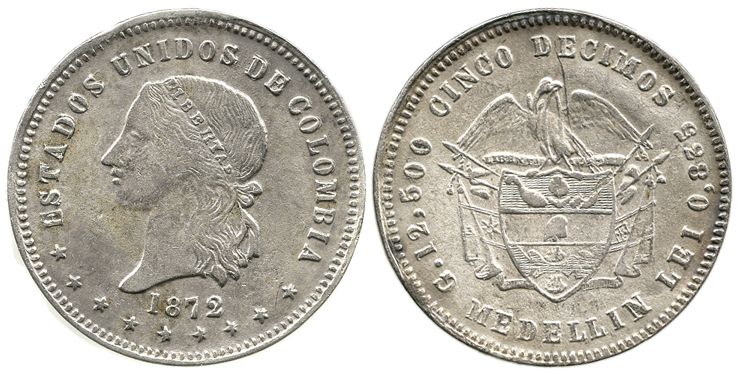 Medellin, Colombia, 5 decimos, 1872, ex-Lozano. Restrepo-296.1; KM-153.3. 12.0 grams. Well-struck AU- with light rose toning, slightly grainy surfaces (no luster), rare grade for this type. Pedigreed to the Alberto Lozano Villegas collection (Numismaticos Colombianos auction of November 2000, lot #57).