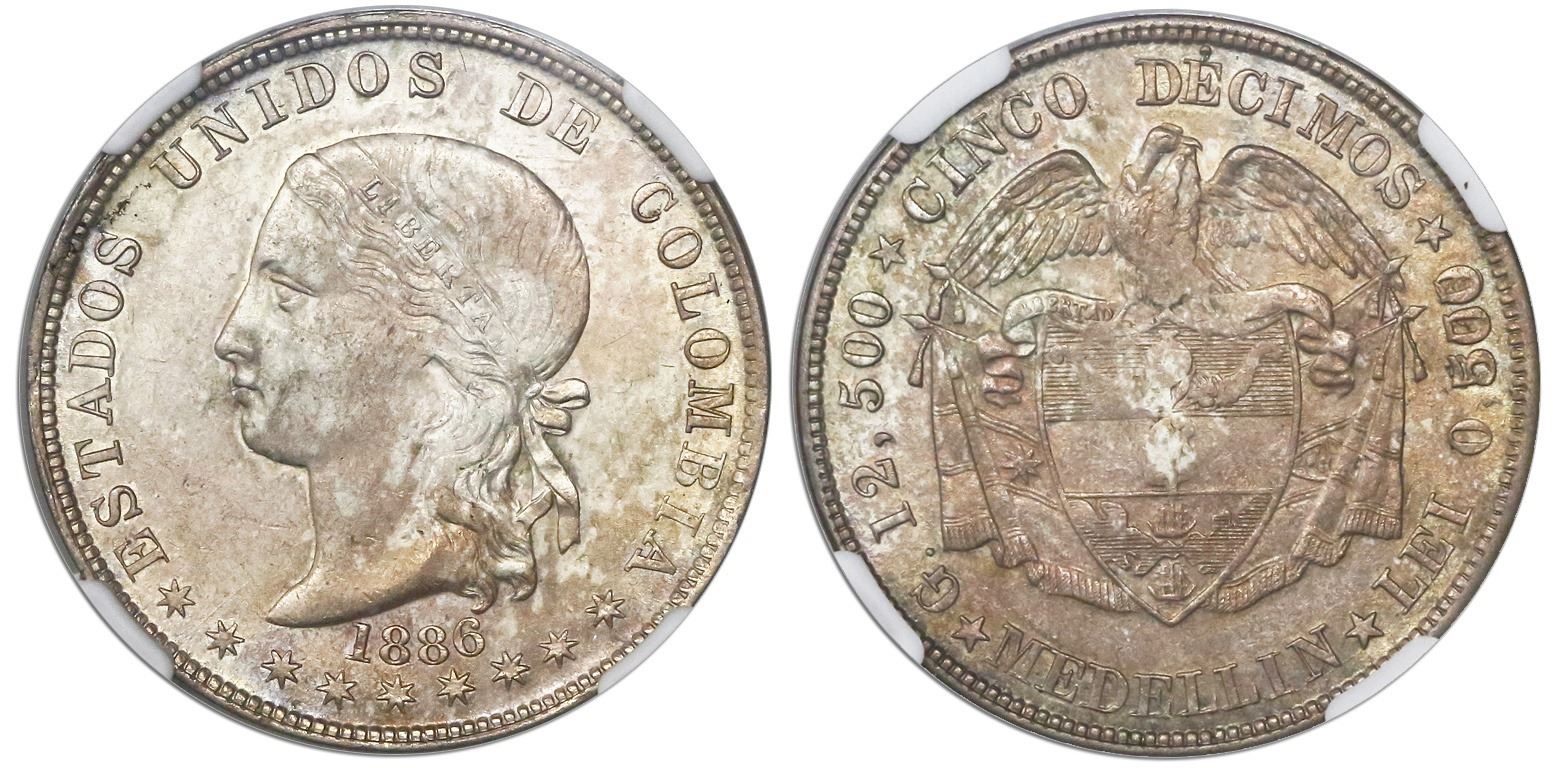 Medellin, Colombia, 5 decimos, 1886, 0.500/0.835, four stars on reverse, rare, encapsulated NGC AU 5