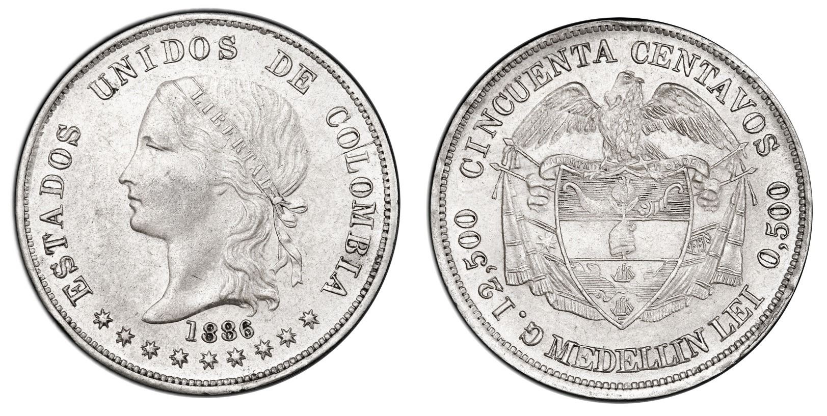 Medellin, Colombia, 5 decimos, 1886, fineness 0,500, PCGS AU58+, finest known in PCGS census.
