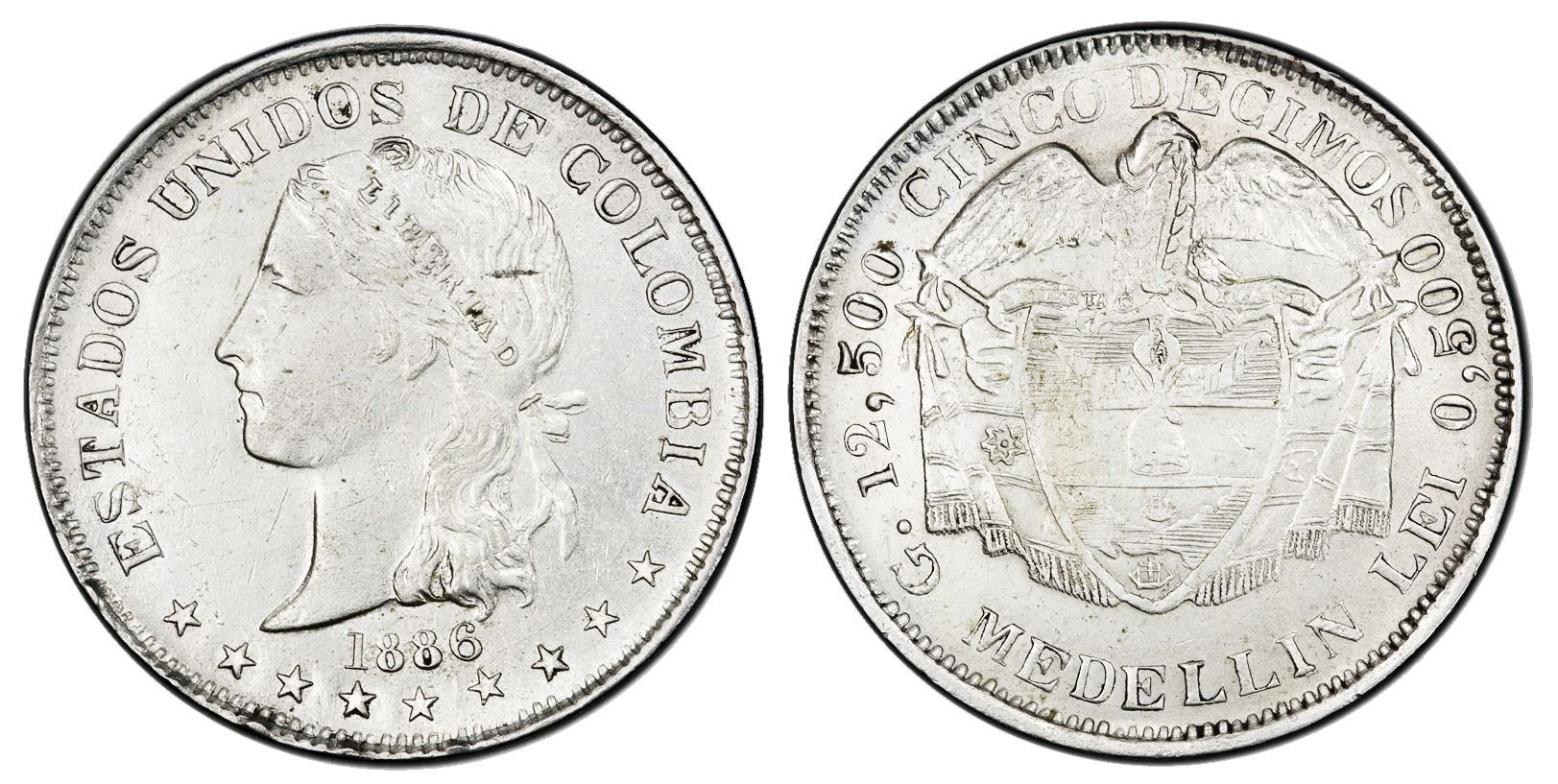 Medellin, Colombia, 5 decimos, 1886, fineness 0,500, very rare, PCGS XF45, Restrepo Plate Coin. Restrepo-304.1; KM-unl. Somewhat bright as non-toned, with all details sharp, clean fineness (not 0,500/0,835, also with different shield), rim below date affected by off-center edge-lettering, numerically second finest in PCGS census behind a single AU53 but the strike on that coin is much cruder (might also be mis-attributed), also with desirable pedigree. PCGS #39228016. Pedigreed to the Nueva Granada Collection, and Plate Coin on page 196 of Restrepo's Coins of Colombia (2012).