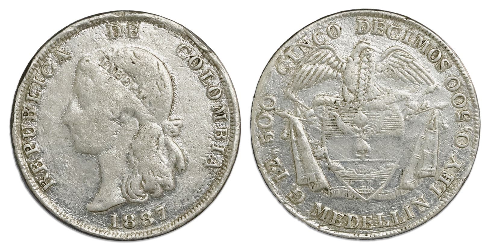 Medellin, Colombia, 5 decimos, 1887, elongated head, extremely rare, PCGS F detail / repaired. Restrepo-402.1; KM-unl. Bold details for the grade, with very bright and somewhat crude surfaces from polishing, so rare that Restrepo states only three are known. PCGS #39227627. Pedigreed to the Nueva Granada Collection (stated on label).