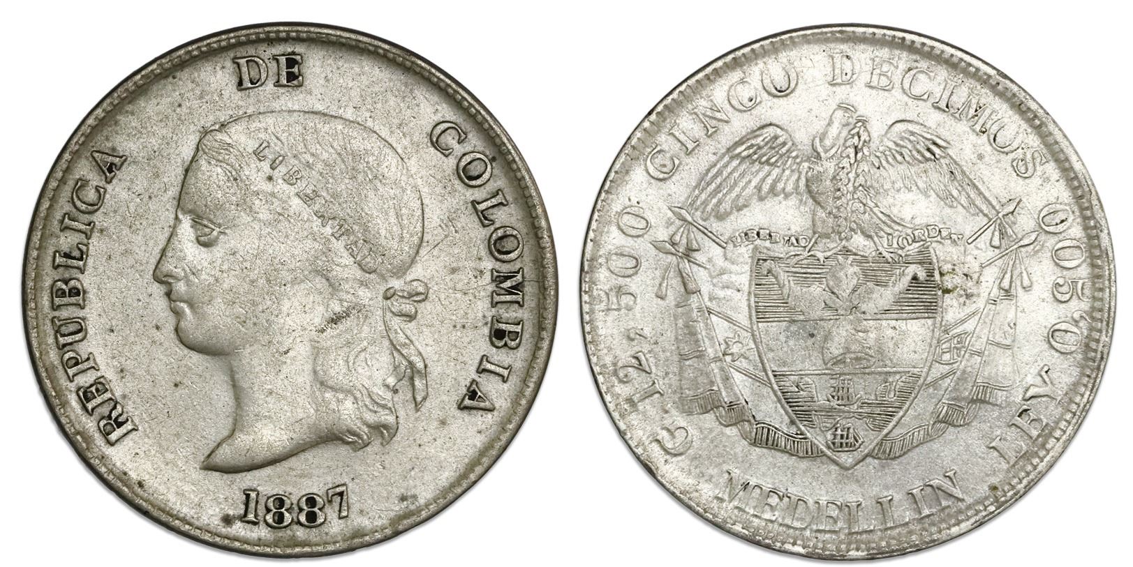 Medellin, Colombia, 5 decimos, 1887, inverted 5 in fineness, PCGS VF detail / cleaned.
