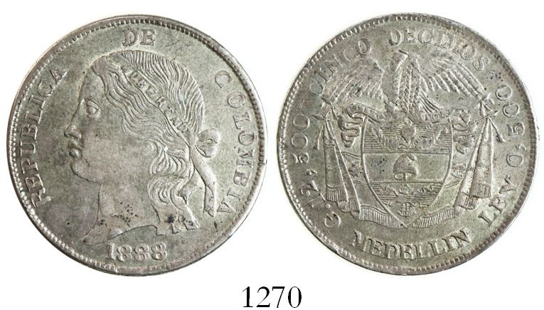 Medellin, Colombia, 5 decimos, 1888, "mulatta" head. Restrepo-403.1; KM-166. 11.88 grams. Nice XF with light toning over underlying luster, no problems.