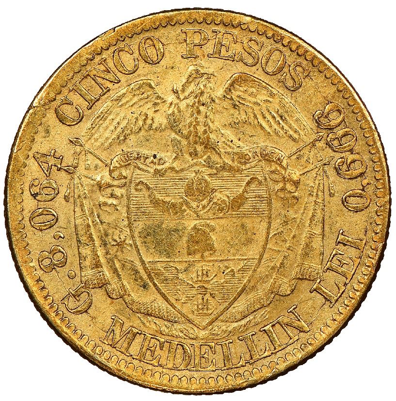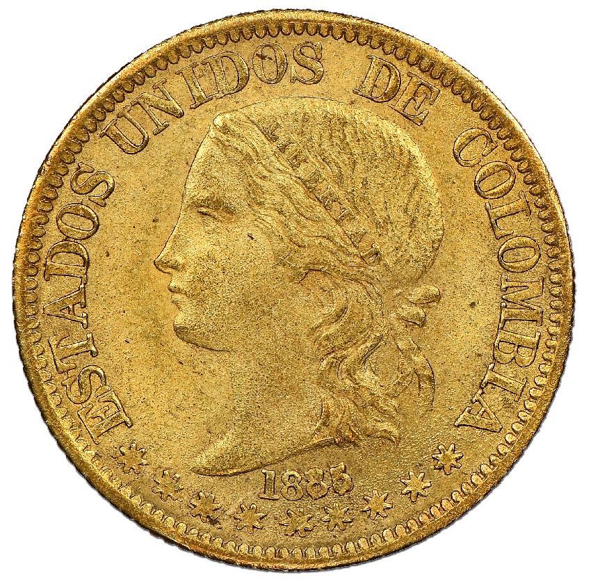 Medellin, Colombia, gold 5 pesos, 1885/74, fineness 0.666/0.900, very rare, NGC MS 63+, finest known in NGC census. Restrepo-330; Sed-38; KM-163. As close to pristine as this type comes, with choice details and no marks or wear, just a few very slightly crude spots on rims (as made), non-lustrous and granular surfaces in dull color from low fineness, clear overdate and 6/9 in fineness, die-cracks in reverse legends, from a three-coin issue (2, 5 and 10 pesos of 1885-6) that barely survived, best explained by Dr. Frank Sedwick in his book The Gold Coinage of Gran Colombia (1991): "In the long interval between 1878 and 1913, Colombia issued no gold coins except these three matching pieces, all recut from earlier dies. No record indicates how many of these coins were minted, but the issue must have been very small. This, however, is probably not the main reason for their rarity. It was their unacceptably low gold content, the only 16-karat gold coins ever issued by any Colombian government, that destined them to the melting pots. The survival of any of these .666 pieces is a miracle, for they were coins that nobody wanted, and were issued at a time when serious collectors of Colombian coins hardly existed." Curiously, NGC lists a couple 1885 entries without the 85/74 overdate, which we suspect are erroneous, but neither of those approaches the grade level of this finest-known piece, which dominates above two other straight-grade XF 40's in the census as well as Dr. Sedwick's XF details example for the properly attributed 1885/74 overdate. NGC #5930643-010.