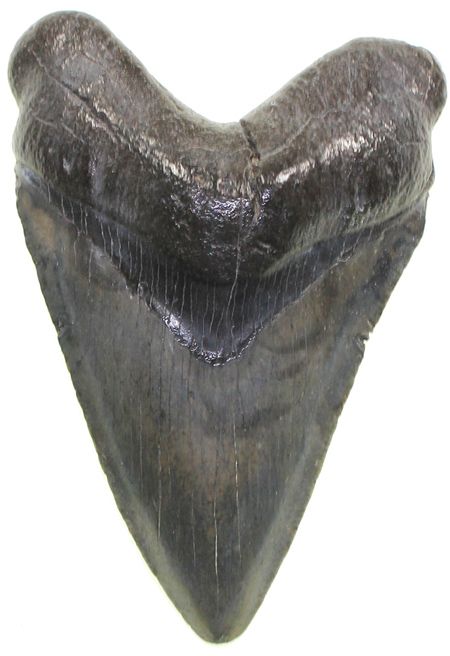Medium megalodon (shark) tooth, from the coast of South Carolina, approx. 25 million years old. 113 grams, 4". A large and completely intact specimen, no chips or breaks except for a natural fissure at top and maybe a slight blunting at the tip, nice gray color, popular fossil collectible.