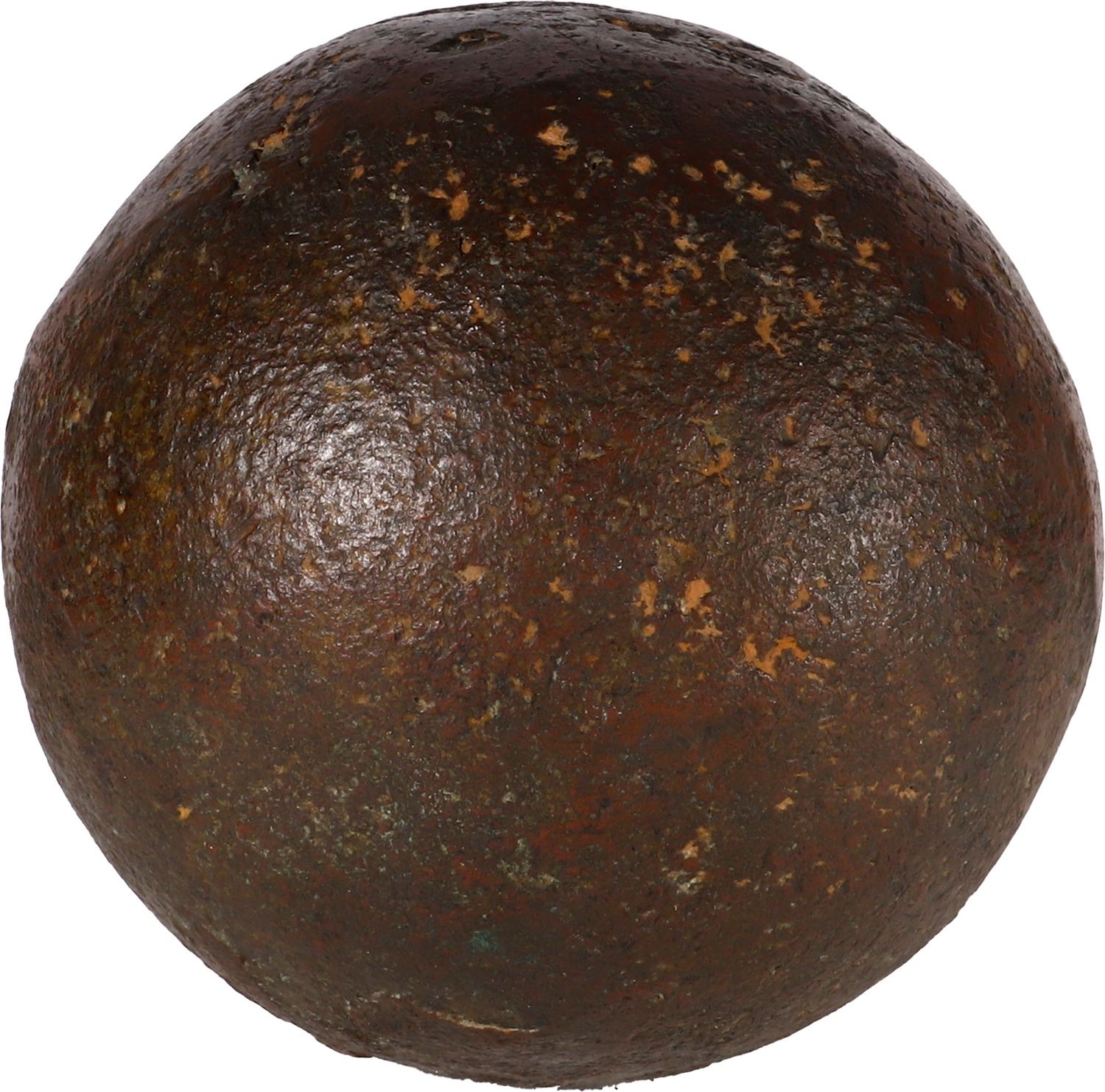 Medium-sized bronze cannonball, probably 1600s. 14 lbs. 4' in diameter. A rare solid and heavy sphere of bronze (iron being the usual metal of choice), pockmarks here and there, some sedimentation in crevices, reportedly found in southern Haiti.