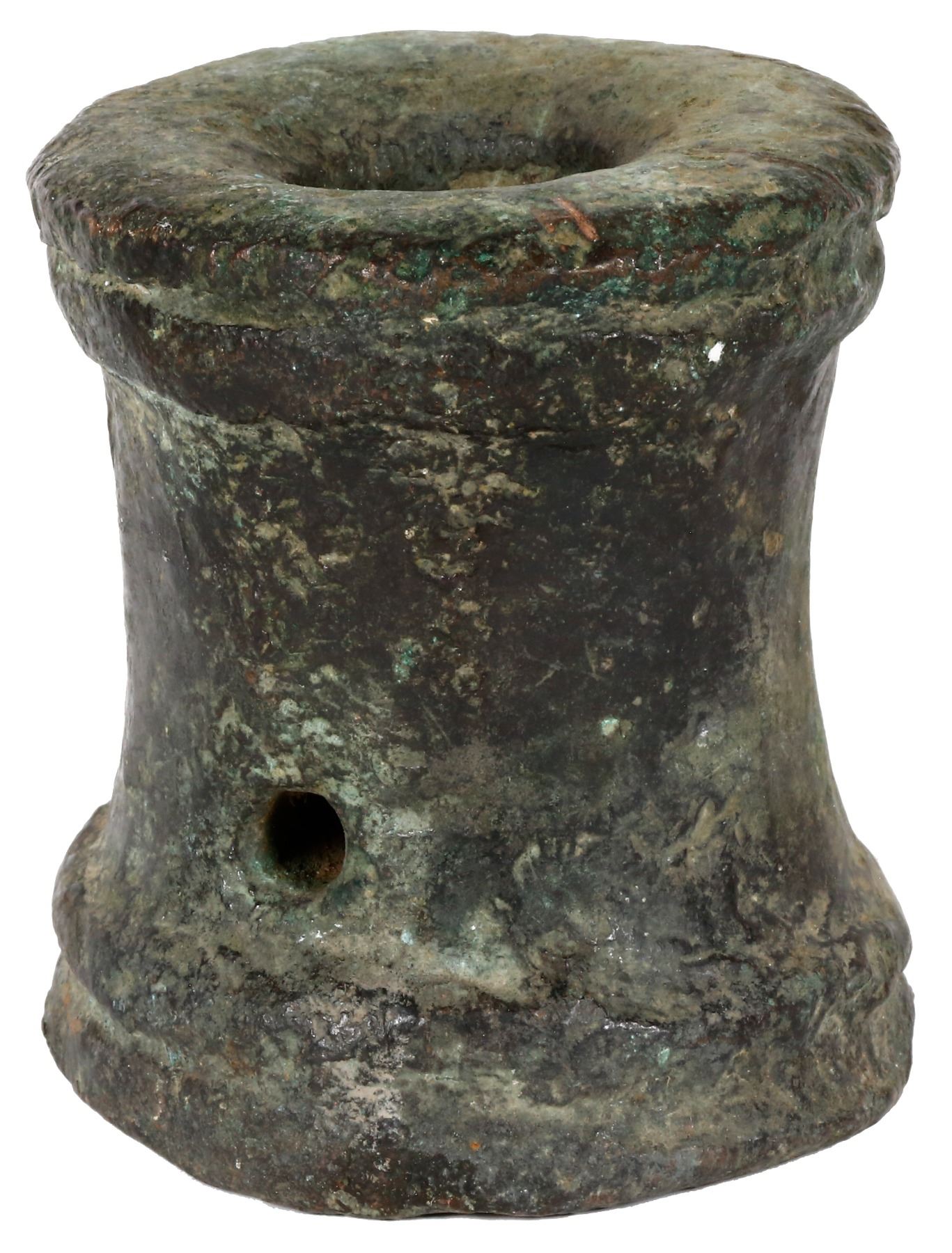 Medium-sized bronze signal cannon (mortar), Spanish colonial (1500s-1600s). 2559 grams. 3½" x 3". Short, crude, flat-bottomed cannon used to send up signals or to test powder, this one thicker and with a larger touchhole near the bottom, patination all over.