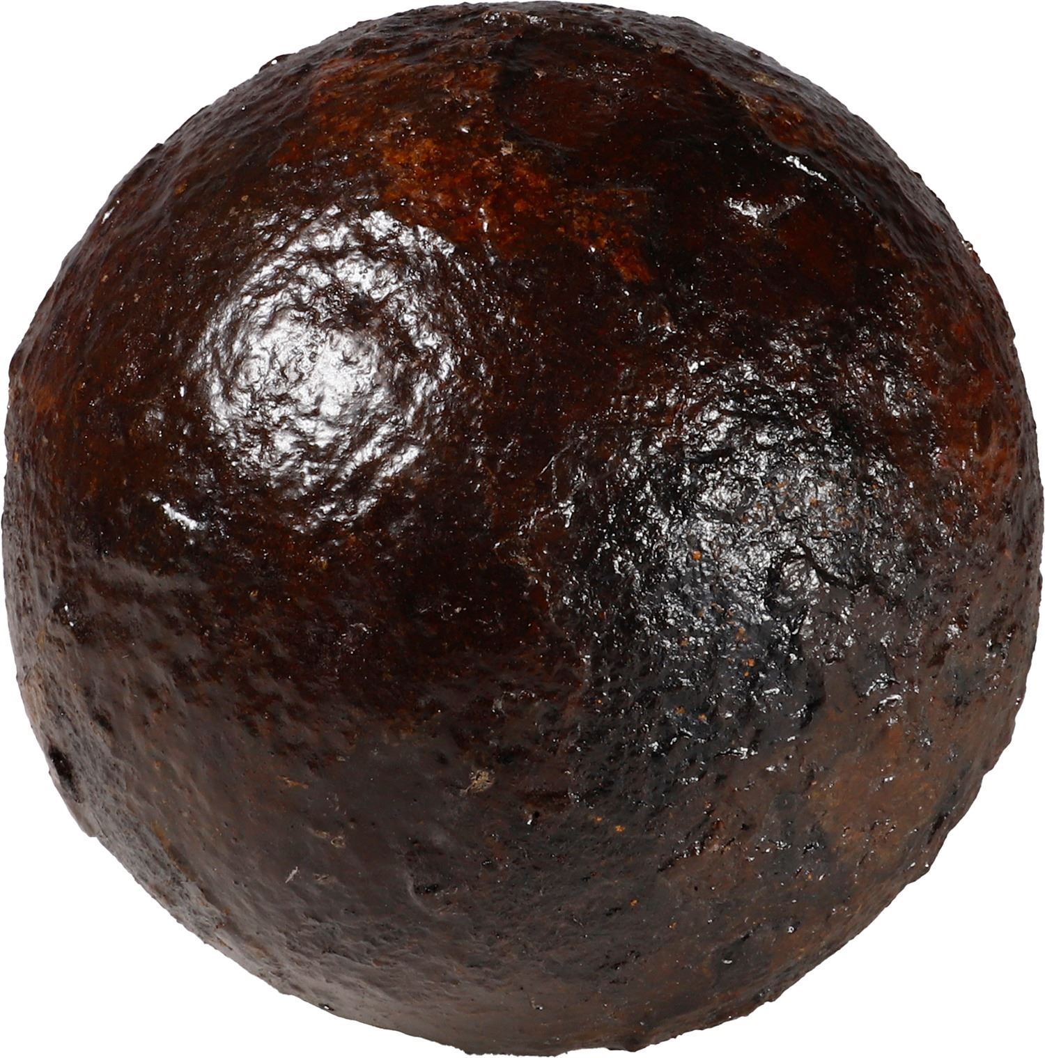 Medium-sized iron cannonball, Spanish colonial (1500s-1700s). 2253 grams. 3½" diameter. A typical heavy cannonball, pockmarked but conserved, dark brown in appearance.