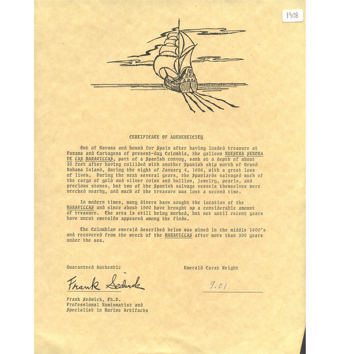 Medium-sized natural emerald, 9.01 carats, with (1990) Frank Sedwick certificate. About 5/8" x 3/8" x 3/8". A dark lump with green overtones, no translucence at all. With Frank Sedwick certificate (from 1990). Recovered from: Maravillas, sunk in 1656 off Grand Bahama Island