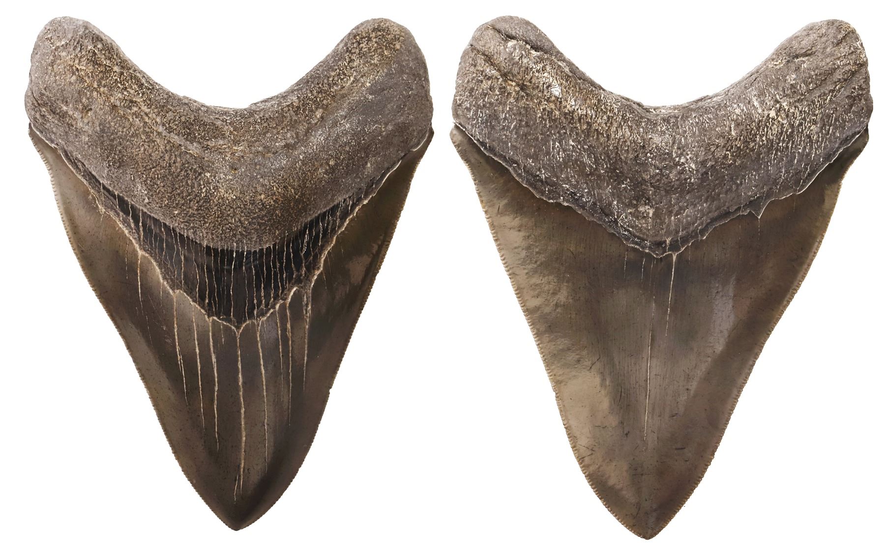 Megalodon (giant shark) tooth, Miocene epoch, approx. 15 to 5 million years old, found off the Atlantic coast of the United States. 159 grams. 4½" x 3½". Small, complete fossilized tooth from Carcharocles megalodon (meaning "big tooth"), an extinct species of giant shark, with polished gray enamel, intact serrated edges, and matte dark gray root.