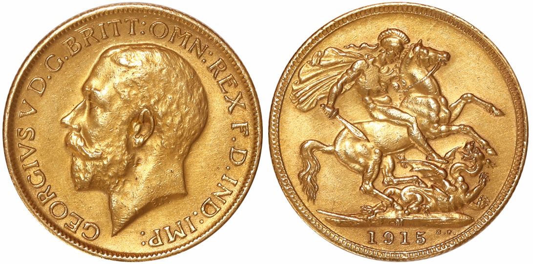 Melbourne, Australia, sovereign, George V, 1915-M. KM-29. 7.96 grams. Choice Mint State (minimal marks), nicely toned, muted luster.