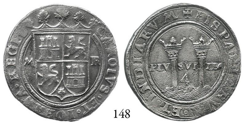 Mexico, 4 reales, Charles-Joanna, "Late Series," mintmark M to left, assayer R to right, rare. S-M7, KM-18, CT-90. 13.2 grams. Broad, round flan with nearly full legends, nice inner details, no doubling, very light corrosion only in spots. Recovered from: Unidentified ca.-1554 wreck off Santo Domingo, Dominican Republic