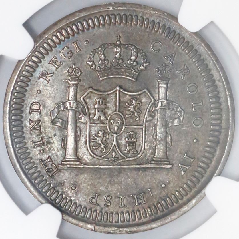 Mexico, 4 reales-sized silver proclamation medal, Charles IV, 1790, Campeche Proclamation, NGC AU 58. Grove-C47. 13.33 grams. Well struck with sharp details, muted rainbow toning throughout. NGC #4687025-007.