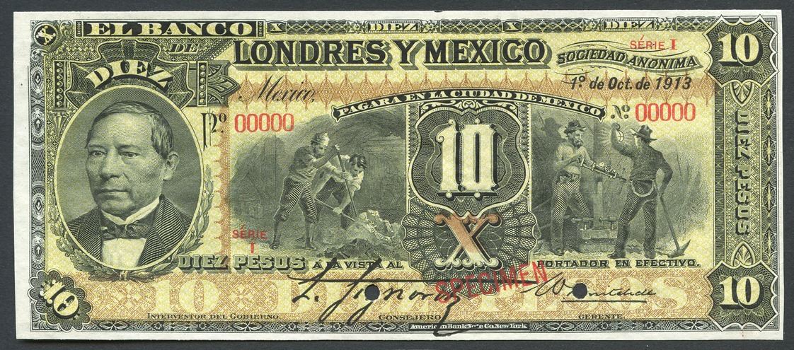 Mexico City, Distrito Federal, Mexico, Banco de Londres y Mexico, 10 pesos specimen, 1-10-1913, series I. Frampton-M272s; SCWPM-S234 (for type). Two POCs. Unlisted specimen in the Standard Catalog. Crisp UNC with strong paper wave and good color.