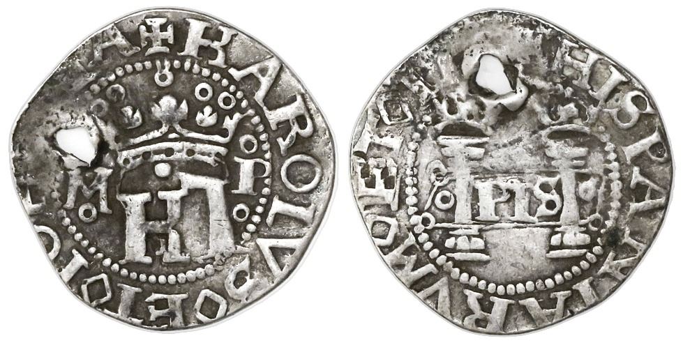 Mexico City, Mexico, 1/2 real, Charles-Joanna, "Early Series," assayer P to right, mintmark M to left (oMo-oPo), rare. Nesmith-23a; CT-187 type; S-M4.. 1.55 grams. Excellent strike (full legends and inner details) and nicely toned but with crude hole at top of pillars, VF.