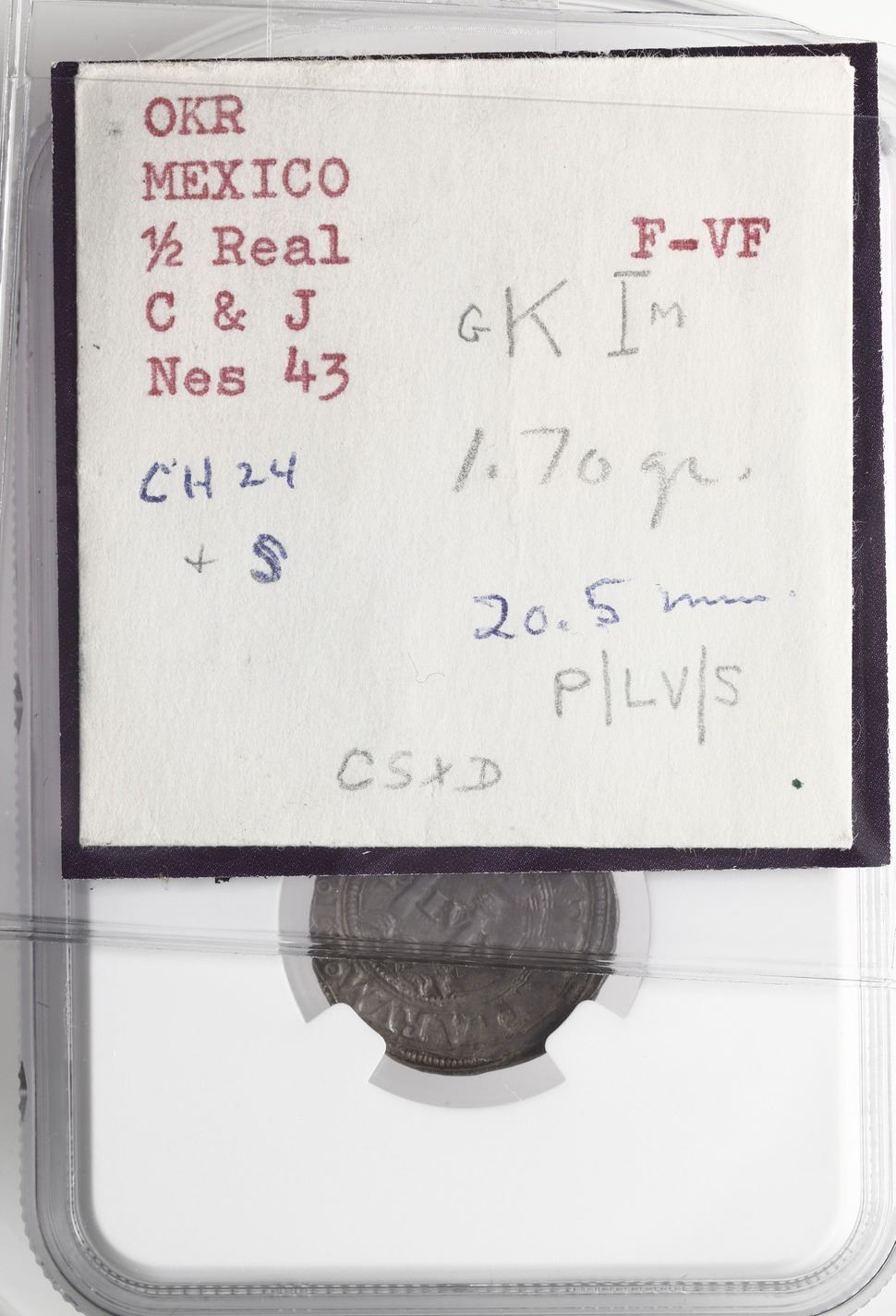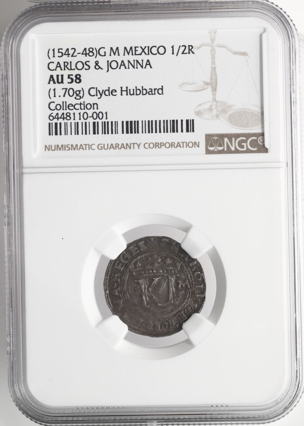 Mexico City, Mexico, 1/2 real, Charles-Joanna, "Late Series," assayer G to left, mintmark M to right of monogram (G-M), motto P-LV-S, king's name as CHAROLVS, NGC AU 58, finest and only example in NGC census, ex-Rumbel, Nesmith Plate Coin. Nesmith-43; Cal-47; S-M5; KM-6.5. 1.70 grams. High-grade beauty with lovely chocolate toning all over, large planchet with most of the legend visible, early coinage under this assayer using CHAROLVS for king's name. This coin is another of Hubbard's purchases from the Christensen sale of the O.K. Rumbel collection, the photo of which was also memorialized on Plate V of Nesmith's book. NGC #6448110-001. Pedigreed to the Clyde Hubbard Collection of Mexican Charles-Joanna Coinage (stated on label) and as a photo on Plate V of Robert Nesmith's The Coinage of the First Mint of the Americas at Mexico City, 1536-1572 (1955) and to the Henry Christensen Auction of October 1959 of the O.K. Rumbel collection, lot 555. Accompanied by original tag or holder from Clyde Hubbard.
