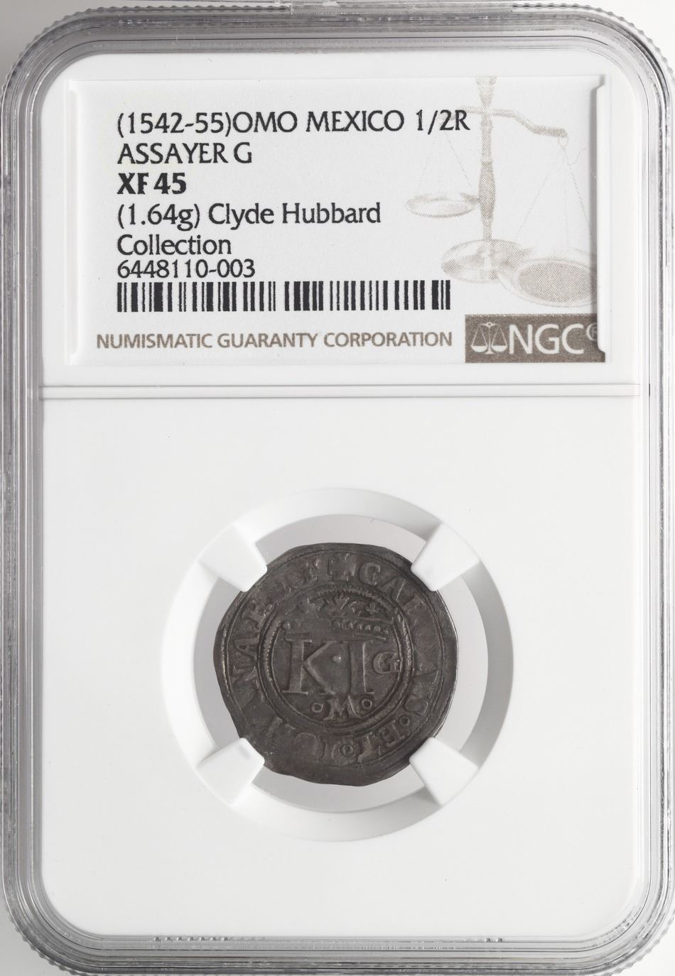 Mexico City, Mexico, 1/2 real, Charles-Joanna, "Late Series," assayer G to right, mintmark oMo below monogram, motto P-LV-S, NGC XF 45, finest known in NGC census. Nesmith-51a type; Cal-unl; S-M5; KM-6.5. 1.64 grams. Unlisted variety in Nesmith without an "o" before KI on the obverse, beautifully toned with a choice broad flan containing full legends. NGC #6448110-003. Pedigreed to the Clyde Hubbard Collection of Mexican Charles-Joanna Coinage (stated on label). Accompanied by original tag or holder from Clyde Hubbard.