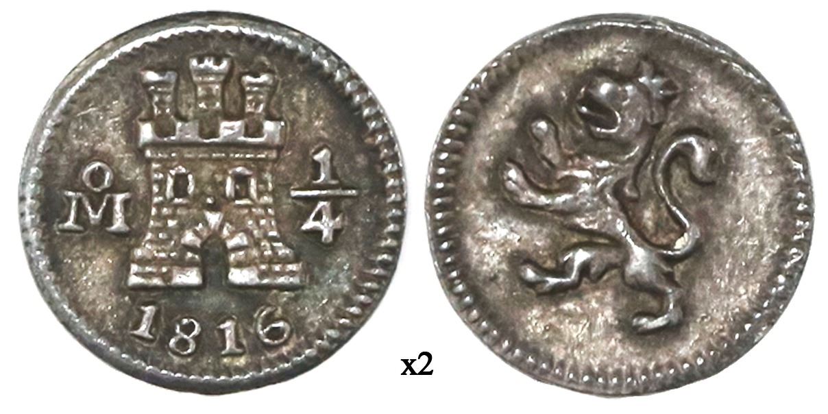Mexico City, Mexico, 1/4 real, 1816, NGC AU 55. KM-62; CT-1474. Bold strike, deeply toned, minimal wear but less lustrous than higher grades. NGC #4724416-008.