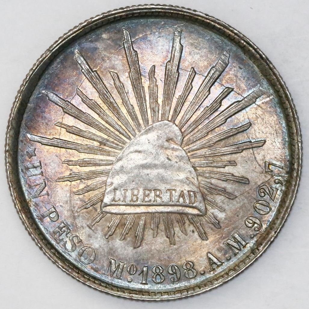 Mexico City, Mexico, 1 peso, 1898AM, original strike. KM-409.2. 26.91 grams. Rainbow-toned UNC, one of the original strikes from 1898 with clear Mo diagnostic (top of O in mintmark matches the top of M).