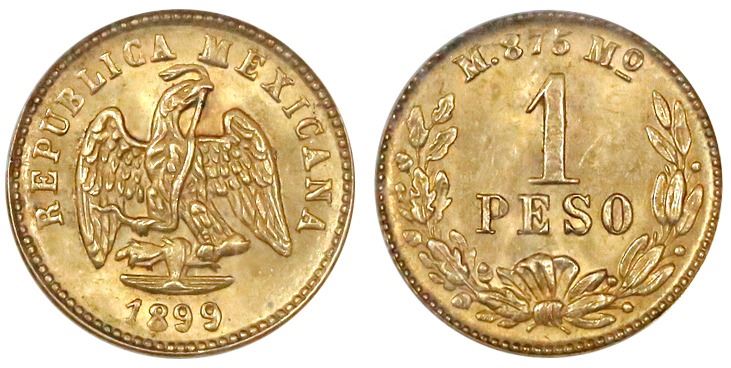 Mexico City, Mexico, 1 peso, 1899M, NGC MS 64. KM-410.5. Muted luster, good strike but with traces of die-clashing. NGC #1662637-002.