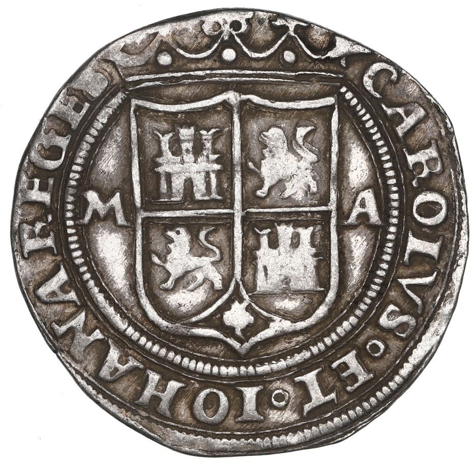 Mexico City, Mexico, 1 real, Charles-Joanna, "Late Series," assayer A to right, mintmark M to left (M-A), top of shield curved, NGC AU 55. Nesmith-56; Cal-68; S-M6; KM-9. 3.36 grams. Slightly off-center strike on a broad flan, choice toning, mostly visible details, curved-top shield design used by both assayers G and A (in this denomination only and not necessarily rare but interesting). NGC #6448110-037. Pedigreed to the Clyde Hubbard Collection of Mexican Charles-Joanna Coinage (stated on label). Accompanied by original tag or holder from Clyde Hubbard.