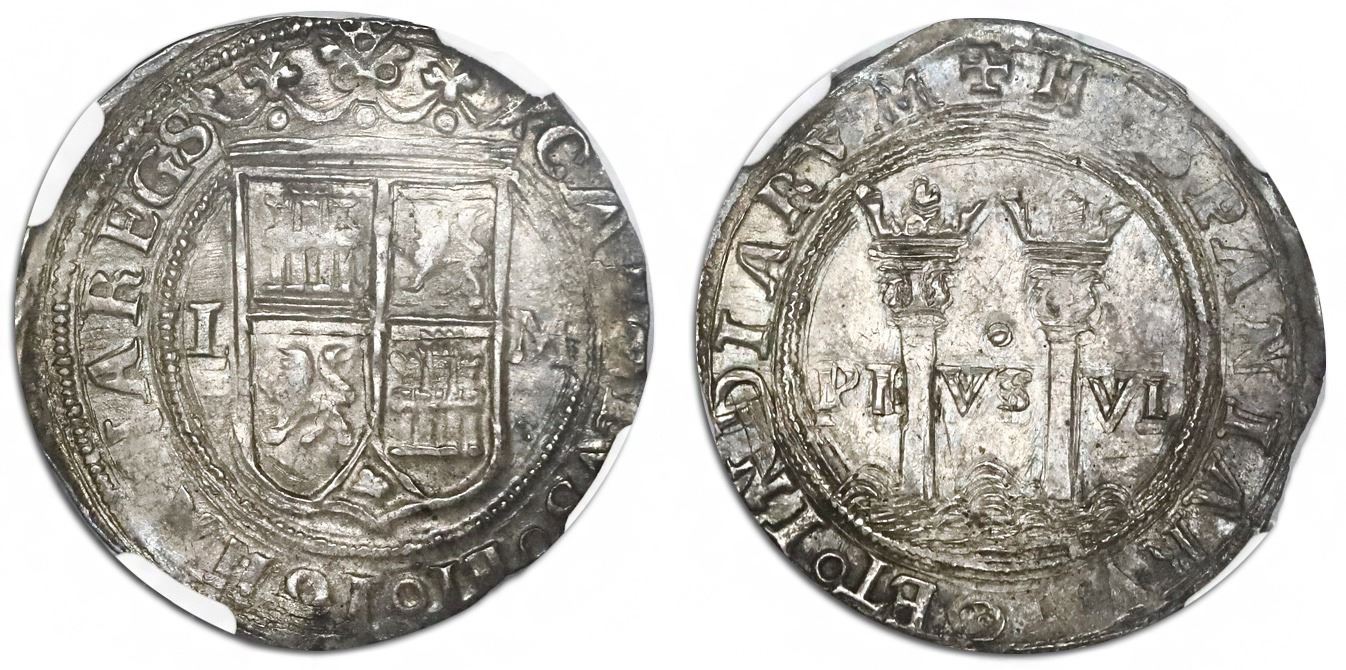 Mexico City, Mexico, 1 real, Charles-Joanna, "Late Series," assayer L to left, mintmark M to right (L-M), NGC MS 63, ex-Potomac Collection (stated on label), "top pop." Nesmith-80c; Cal-73; S-M9; KM-9. 3.40 grams. Sharp full details including legends with luster on fields, patchy rainbow toning, exceptional grade (one of two at this top grade in the NGC census, the next highest being AU 58). NGC #4762849-014. From the Potomac Collection.