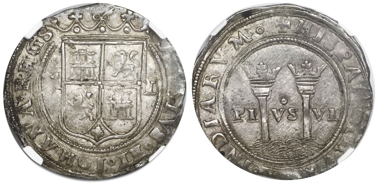 Mexico City, Mexico, 1 real, Charles-Joanna, "Late Series," assayer L to right, mintmark M to left (M-L), NGC AU 58, ex-Potomac Collection (stated on label), "top pop." Nesmith-84; Cal-72; S-M9; KM-9. 3.41 grams. Broad flan with choice full legends and inner details (pillars side slightly off-center), very lightly toned, one of three at this top grade in NGC census. NGC #4762849-012. From the Potomac Collection.
