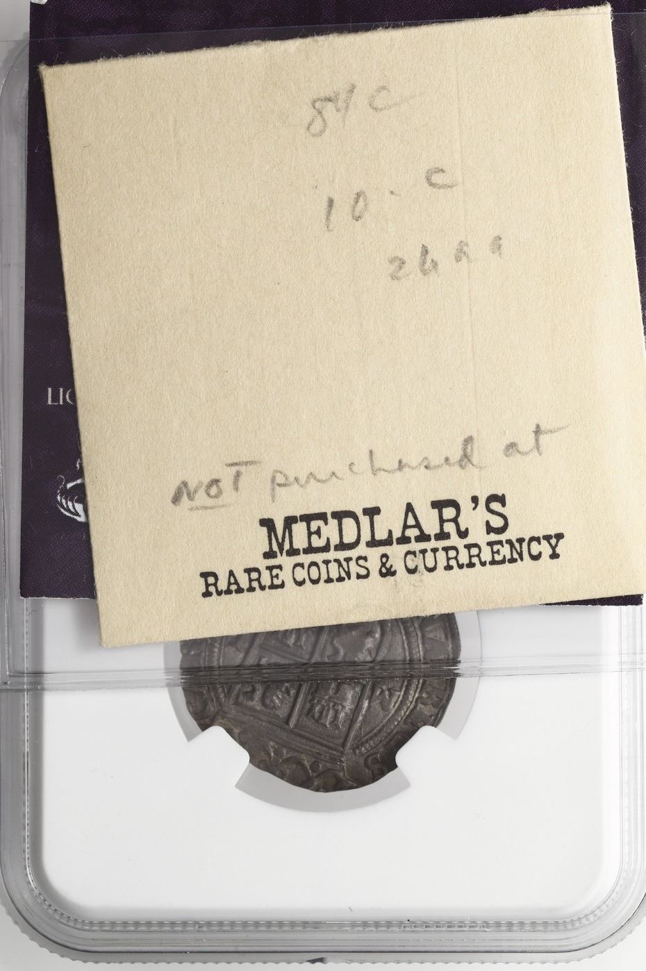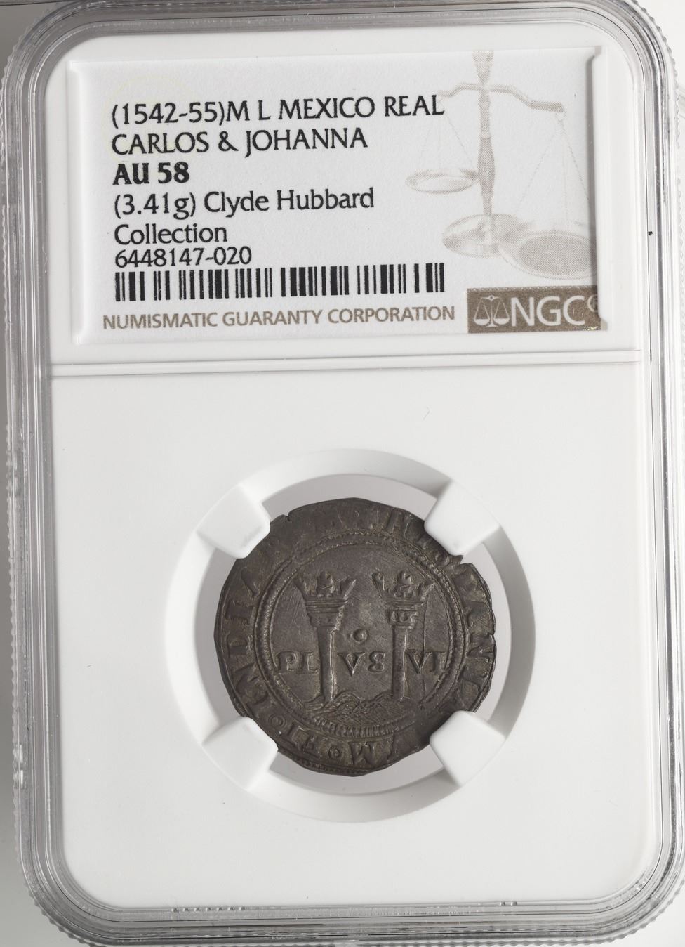 Mexico City, Mexico, 1 real, Charles-Joanna, "Late Series," assayer L to right, mintmark M to left (M-L), NGC AU 58. Nesmith-84c; Cal-72; S-M9; KM-9. 3.41 grams. Second highest grade in the NGC census behind a pair of MS 62's (one being lot 477 below), a high grade considering that Nesmith cataloged 136 of them and NGC shows 30, boldly struck and toned, with full legends and interiors. NGC #6448147-020. Pedigreed to the Clyde Hubbard Collection of Mexican Charles-Joanna Coinage (stated on label). Accompanied by original tag or holder from Clyde Hubbard.