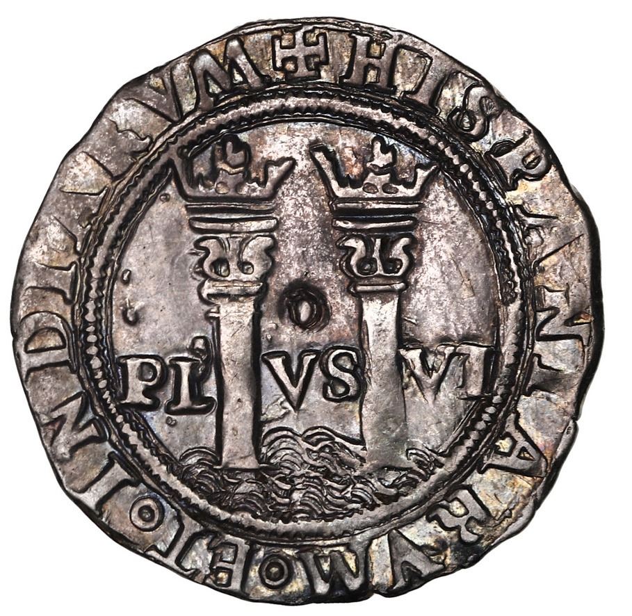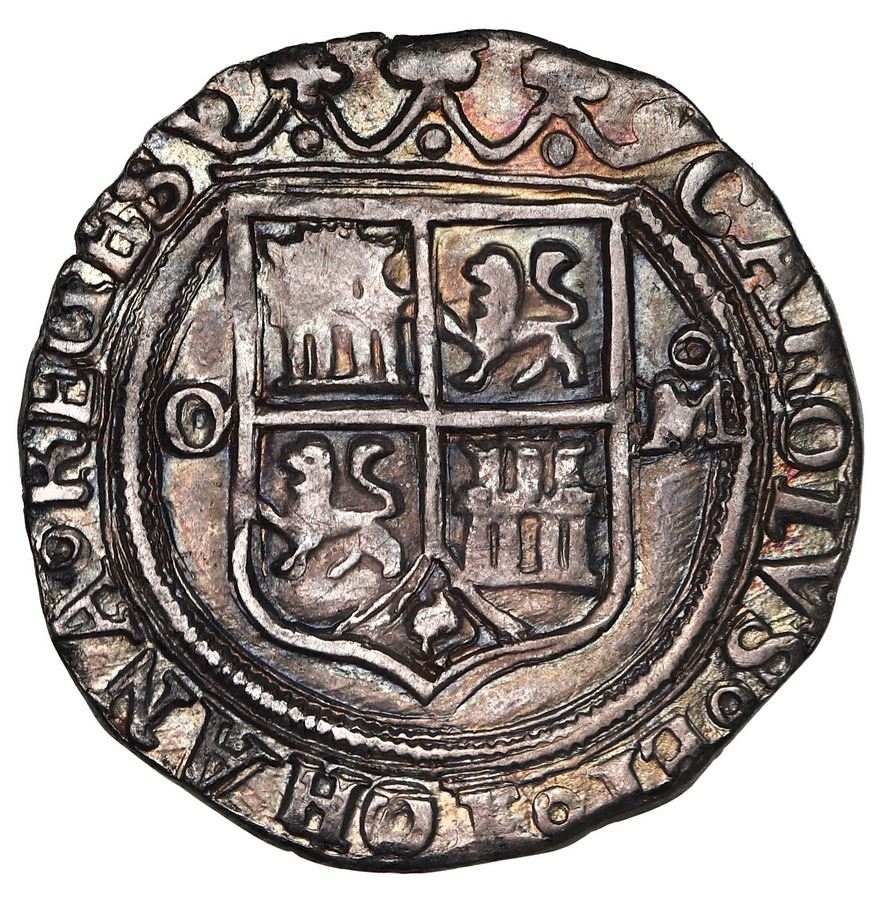Mexico City, Mexico, 1 real, Charles-Joanna, "Late Series," assayer O to left, mintmark oM to right (O-oM), P over inverted P in HISPANIARVM (rare), NGC AU 58, finest known in the NGC census. Nesmith-104; Cal-75; S-M10; KM-9. 3.40 grams. Only one example seen by Nesmith of this particular variety. While variations of this variety are not rare, this one has a curious error of the letter P punched over an upside-down P in HISPANIARVM, with lovely iridescent toning and full legends and inner details. Pedigreed to the Clyde Hubbard Collection of Mexican Charles-Joanna Coinage (stated on label). Accompanied by original tag or holder.