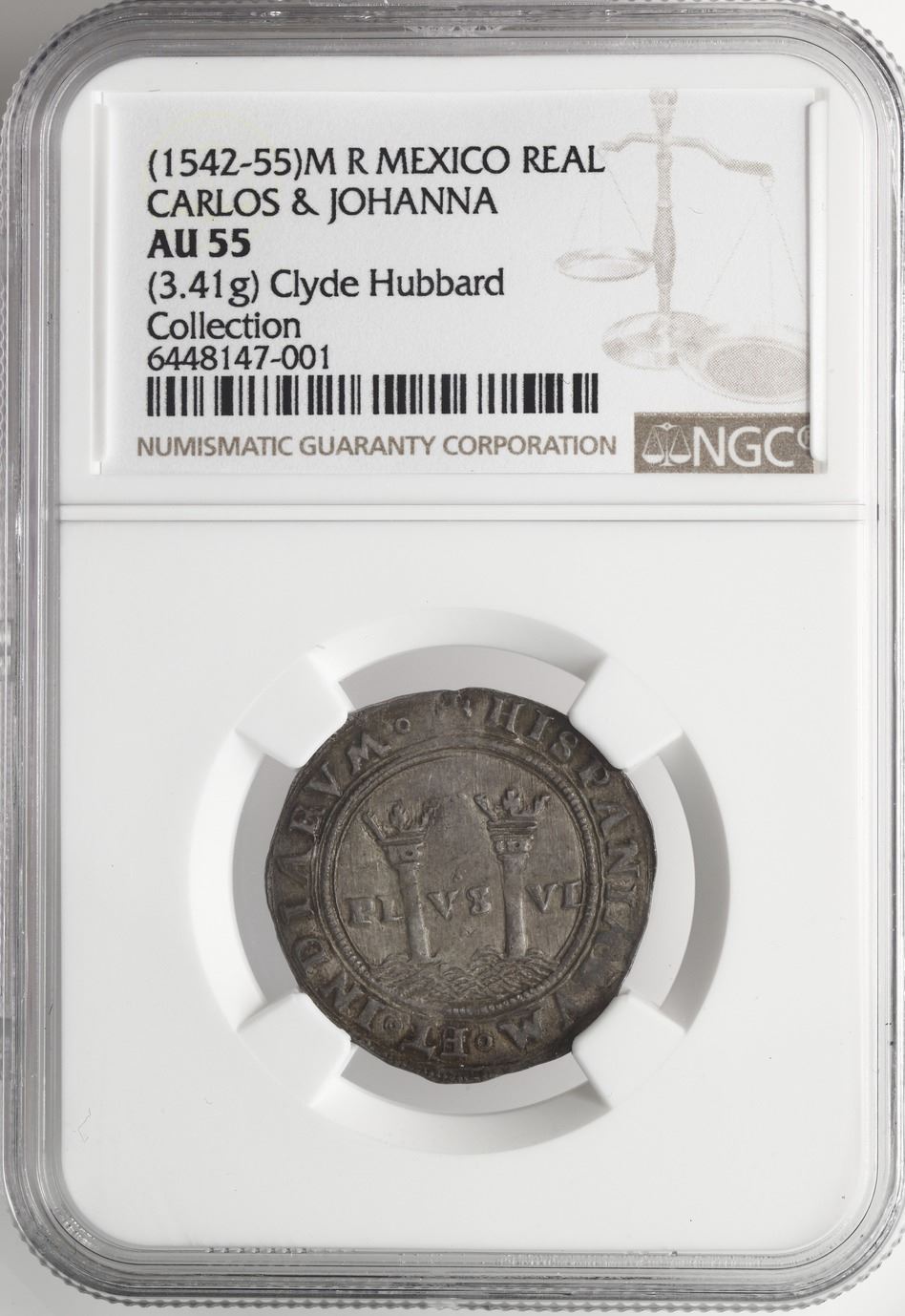 Mexico City, Mexico, 1 real, Charles-Joanna, "Late Series," assayer R to right, mintmark M to left (M-R), NGC AU 55. Nesmith-68a; Cal-70; S-M7; KM-9. 3.41 grams. Tied with previous lot for finest known in NGC census, toned with light luster, deep strike on lettering, full details. NGC #6448147-001. Pedigreed to the Clyde Hubbard Collection of Mexican Charles-Joanna Coinage (stated on label). Accompanied by original tag or holder from Clyde Hubbard.
